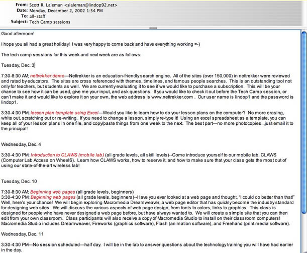 Lastly, I am really excited about our possible laptop program. I have a proposal which I am going to give to the school board next week, in which I will propose using NCLB Title II money to purchase laptops and provide training for teachers. If it goes through, it will be a huge step in getting teachers to use technology in their classrooms, and will be a very large part of what I do next year. We are proposing 70 hours of required staff development from the teachers who receive laptops, the majority of which will be in-house. Planning for this will be my cycle 3, and actually implementing it will be my final cycle.